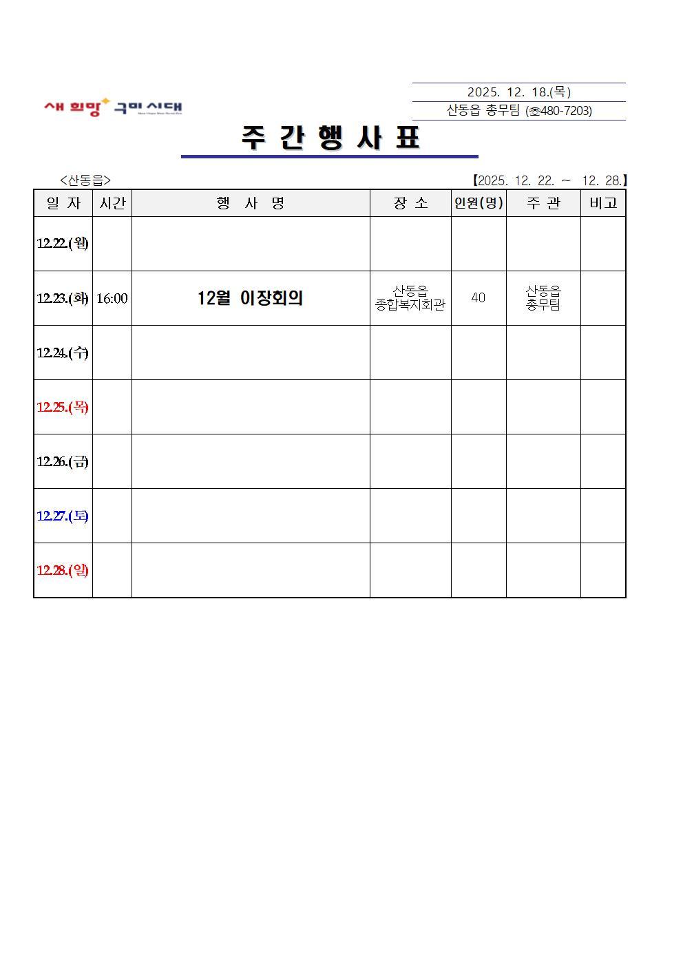 [산동읍] 주간행사표(2025. 12. 22.~12. 28.) 입니다.