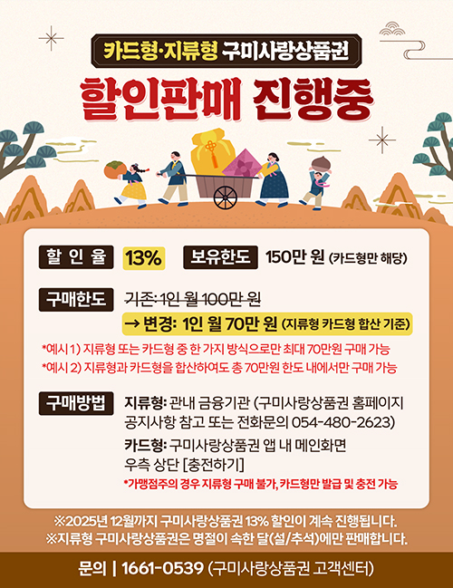 문의처4~5일 | 구미사랑상품권 고객센터(☎ 1661-0539) 구미시청 일자리경제과(☎ 054-480-2623) |