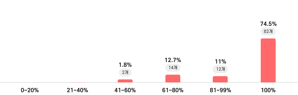 | 0 ~ 20% | 21 ~ 40% | 41 ~ 60% | 61 ~ 80% | 81 ~ 99% | 100% | |
