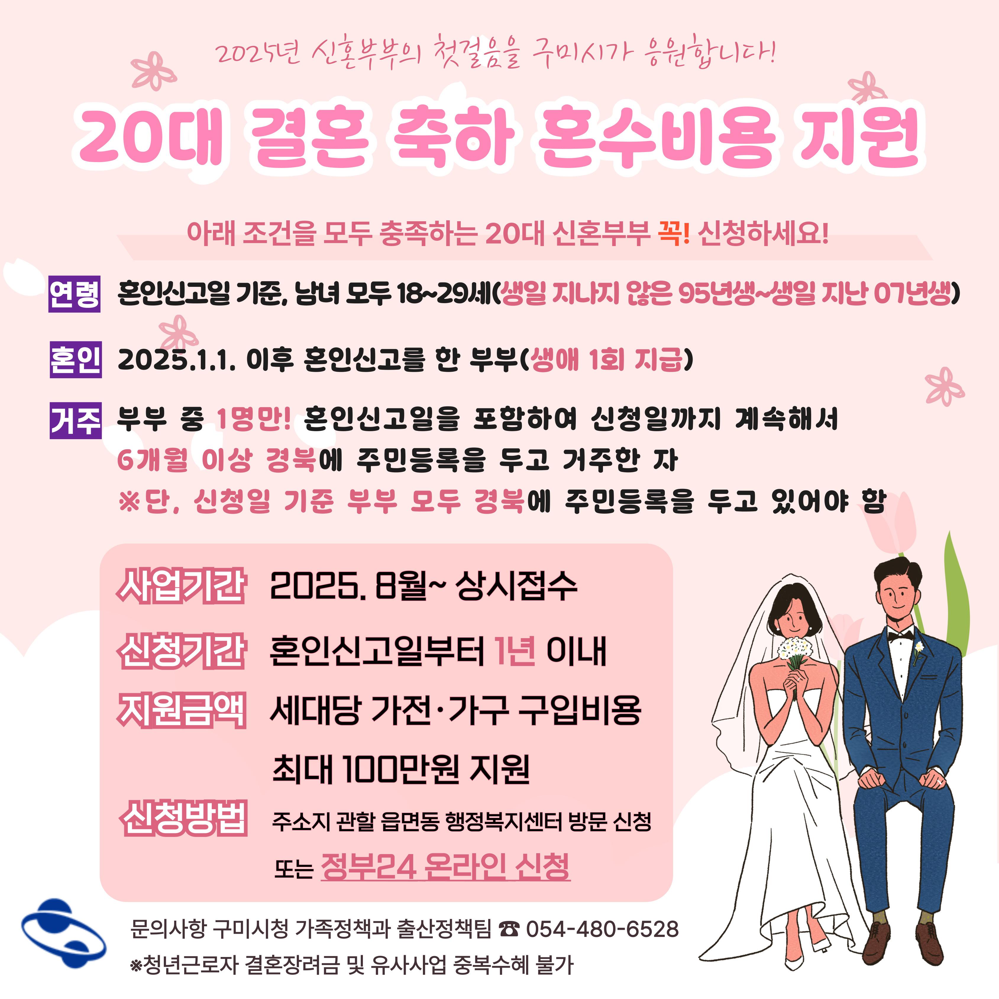 혼인신고자(부부 모두)가 신청일 3개월 전부터 지급시까지 계속하여 주민등록상 구미시 거주자