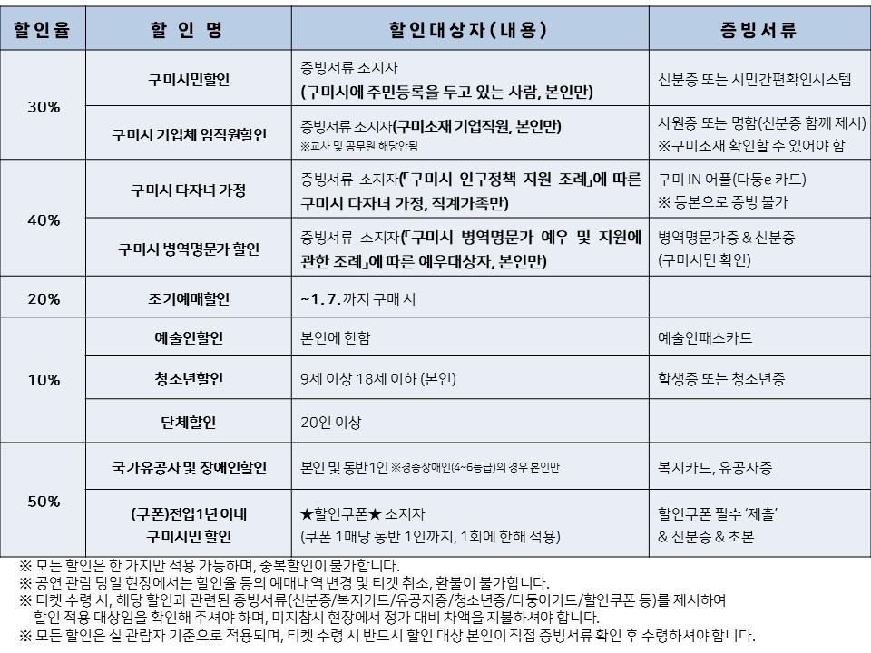 - 할인율 하단 관련이미지 탭 할인율표 참조(조기예매20%(~1/7), 구미시민30% 할인 등)