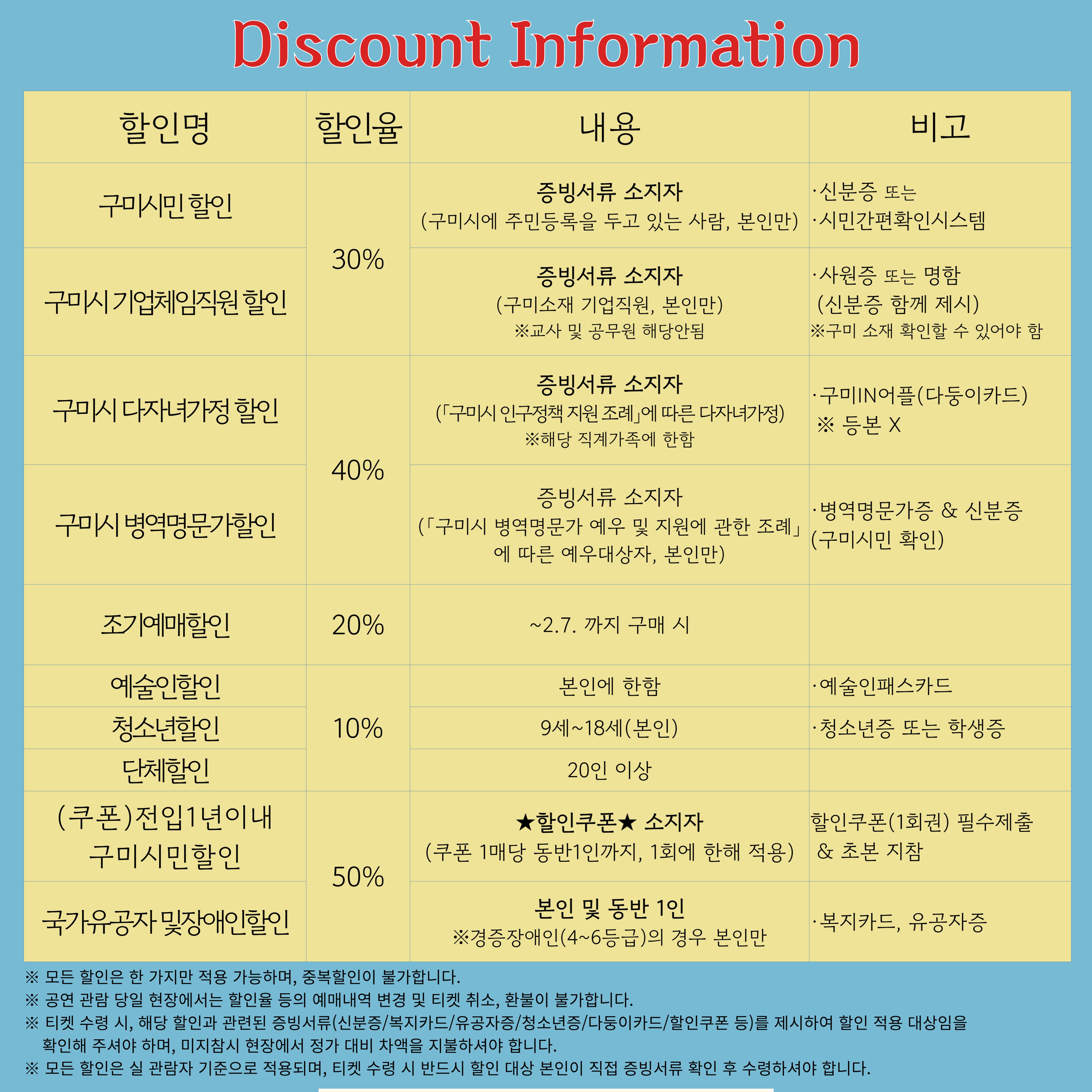 - 할인율 하단 관련이미지 탭 할인율표 참조(조기예매20%(~2/7), 구미시민30% 할인 등)