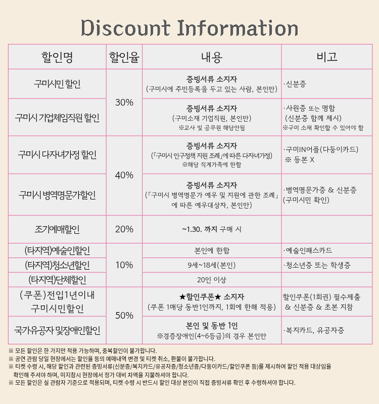 - 할인율 하단 관련 이미지 탭 할인율 표 참조(조기예매20%(~1.30.), 구미시민30% 할인 등)