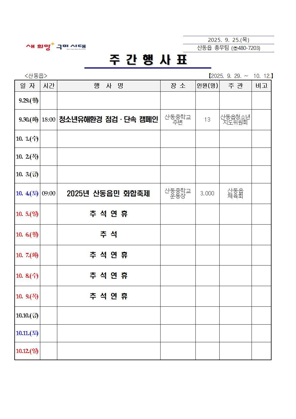 [산동읍] 주간행사표(2025. 9. 29.~10. 12.) 입니다.