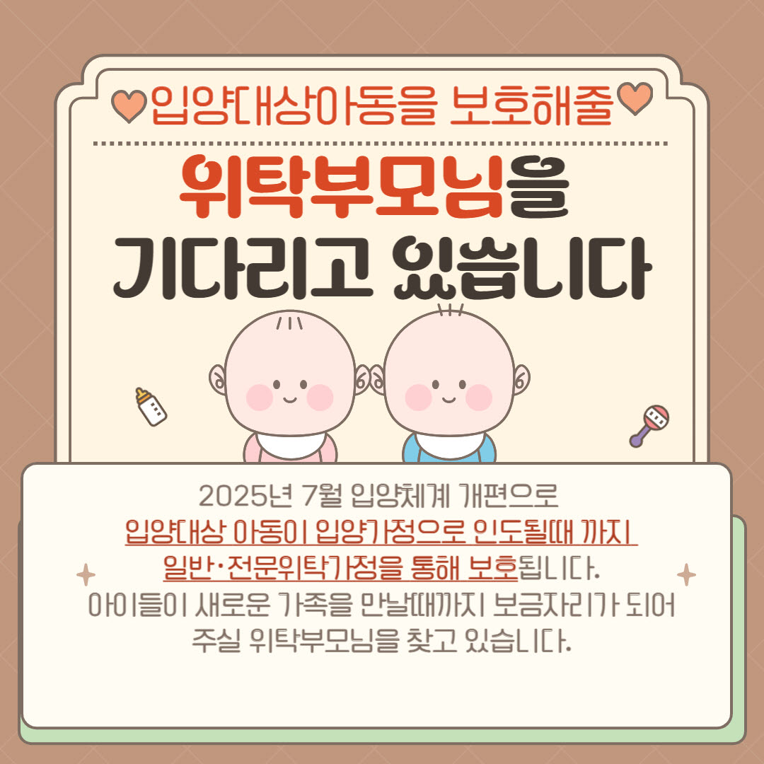 2025년 공적 입양체계 개편으로 입양대상아동이 입양가정으로 인도 될 때 까지 일반·전문위탁가정을 통해 보호됩니다.