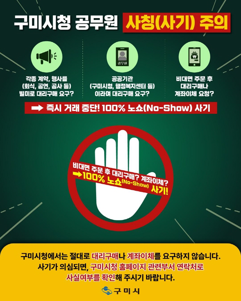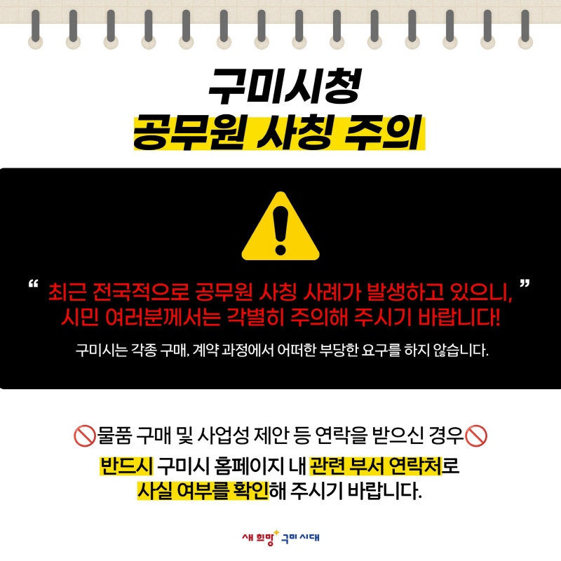 최근 구미시청 공무원을 사칭하여 물품구매를 유도하는 등 전국적으로 공무원 사칭 사례가 지속적으로발생하고 있으니, 시민 여러분께서는 각별히 주의해 주시기 바랍니다.